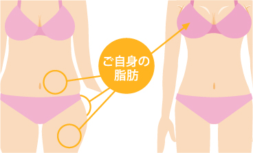 ご自身の太ももや腰回りなどから採取した脂肪を胸に注入する方法です。ご自身の組織を使うことにより、アレルギーや拒絶反応はほとんど起こりません。また、本来の乳房は主に乳腺と脂肪で構成されているため、修正した乳房も感触や見た目が自然に仕上がります。